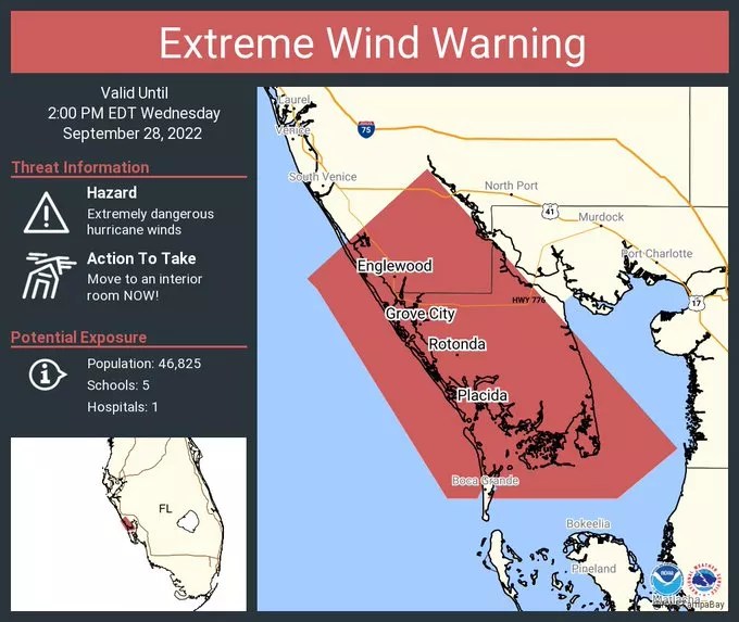The National Hurricane Center issued warnings to residents in the area of Cape Coral, Boca Grande, Sanibel Island, Englewood, Grove City, Rotonda, and Placida to stay inside and not attempt evacuation as they are currently under an “extreme wind warning.”