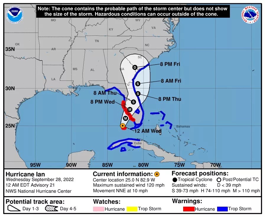 “As the system approaches South Carolina, Ian should maintain this intensity, and Hurricane Warnings have been issued for the entire coast of South Carolina,” the NHC said.