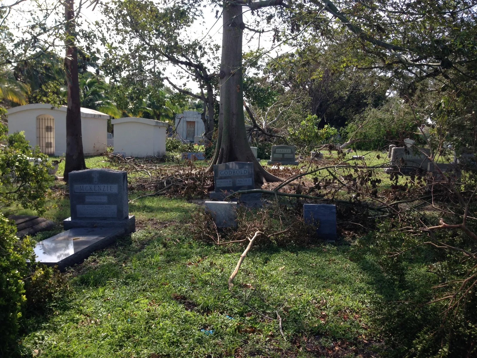 Outside the Miami City Cemetery, tree limbs crowd the narrow sidewalk and a padlock secures the gated entryways. At the east end of the graveyard, dozens of tropical trees – some planted nearly 100 years ago – have toppled onto tombstones.