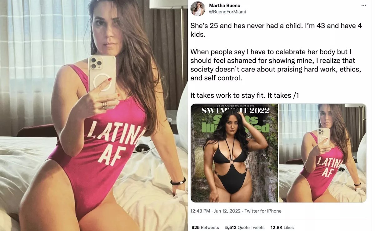 “She’s 25 and has never had a child. I’m 43 and have 4 kids,” Bueno tweeted. “When people say I have to celebrate her body but I should feel ashamed for showing mine, I realize that society doesn’t care about praising hard work, ethics, and self control.”