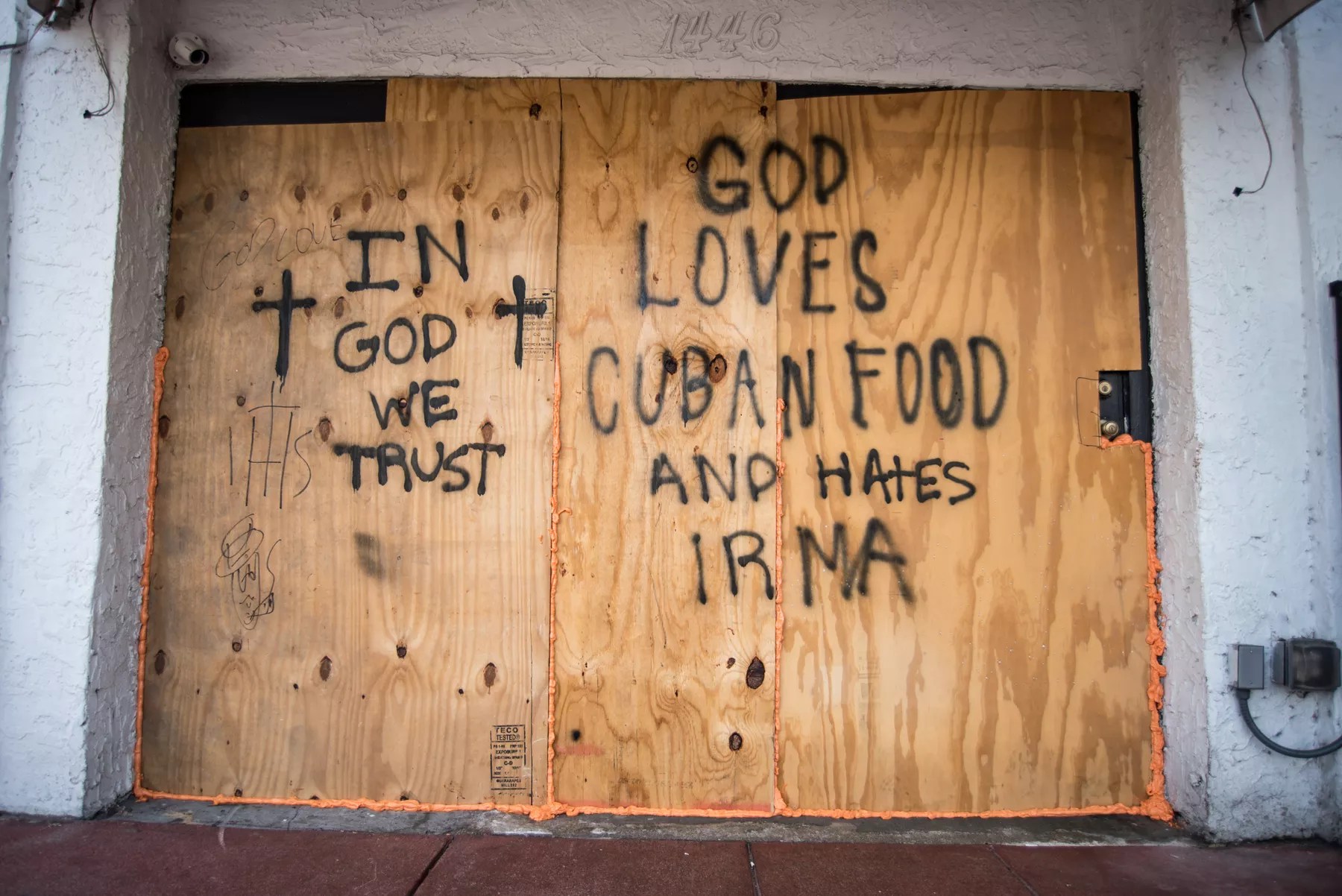 An obstinate spirit took over. Plywood covered nearly every glass surface, many spray-painted with pithy messages: “Irma, you can’t sit with us,” one read. “#ByeFelicia.” On Collins Avenue, someone painted UM’s Sebastian the Ibis declaring, “You don’t scare us Irma.”