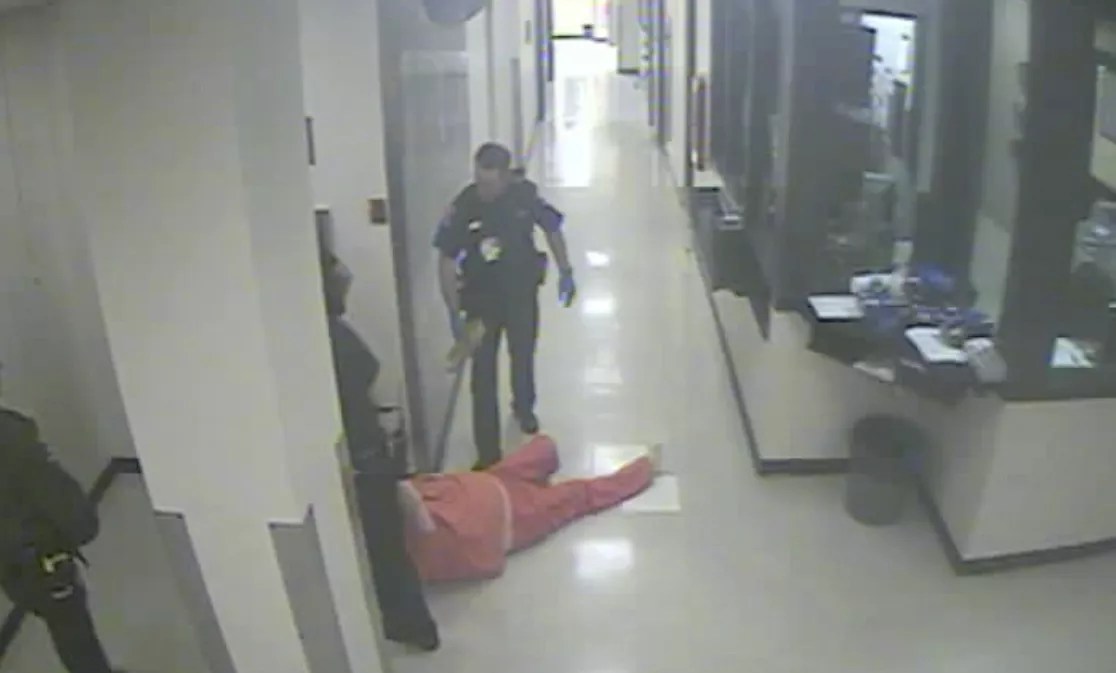 A still image of Karen Ibarra being dragged through the Sarasota County jail.