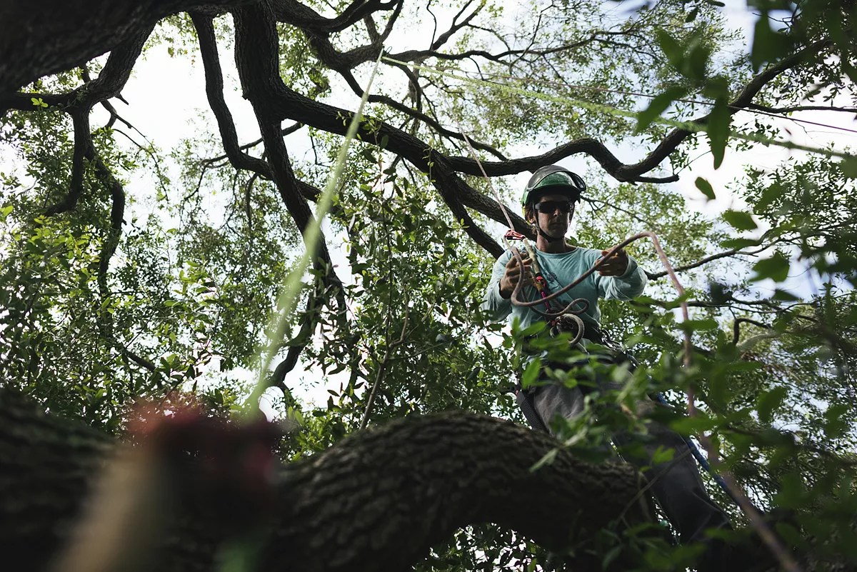 Gerrish never seems to strain. Although he will later wring out his long-sleeved shirt, sopping with sweat, he remains calm, serene, confident in his path. He’s quiet. The only sounds are the occasional click of carabiners, the breeze, the song of a mockingbird, and a passing car. When he arrives at his destination, he draws a handsaw from his utility belt and slices off a small clump of green that floats down through the branches and lands on the grass with a soft whoosh.