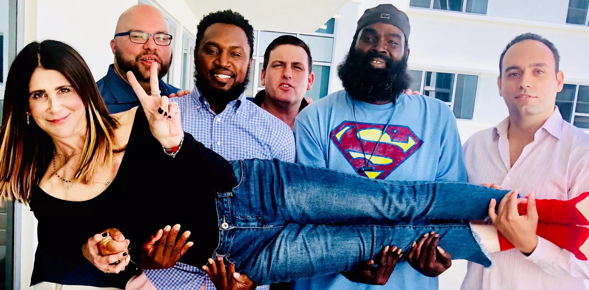 Producer Carla Berkowitz with the five real-life Miami Jackson chess players.