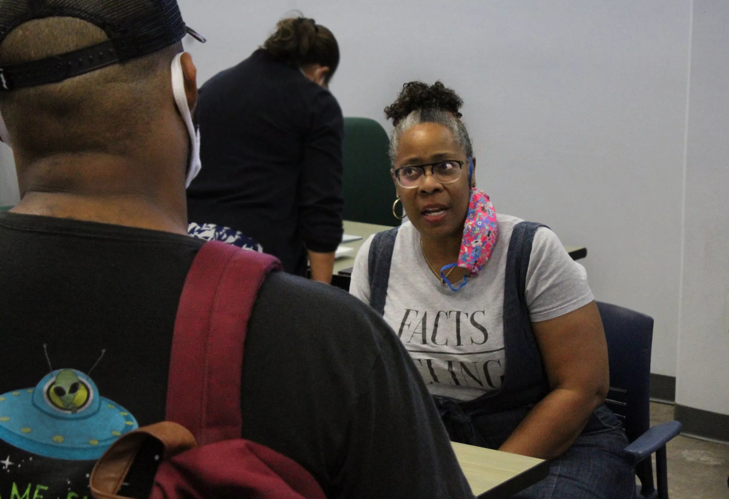 Karla Kennedy speaks to a student at FIU’s first NABJ meeting.