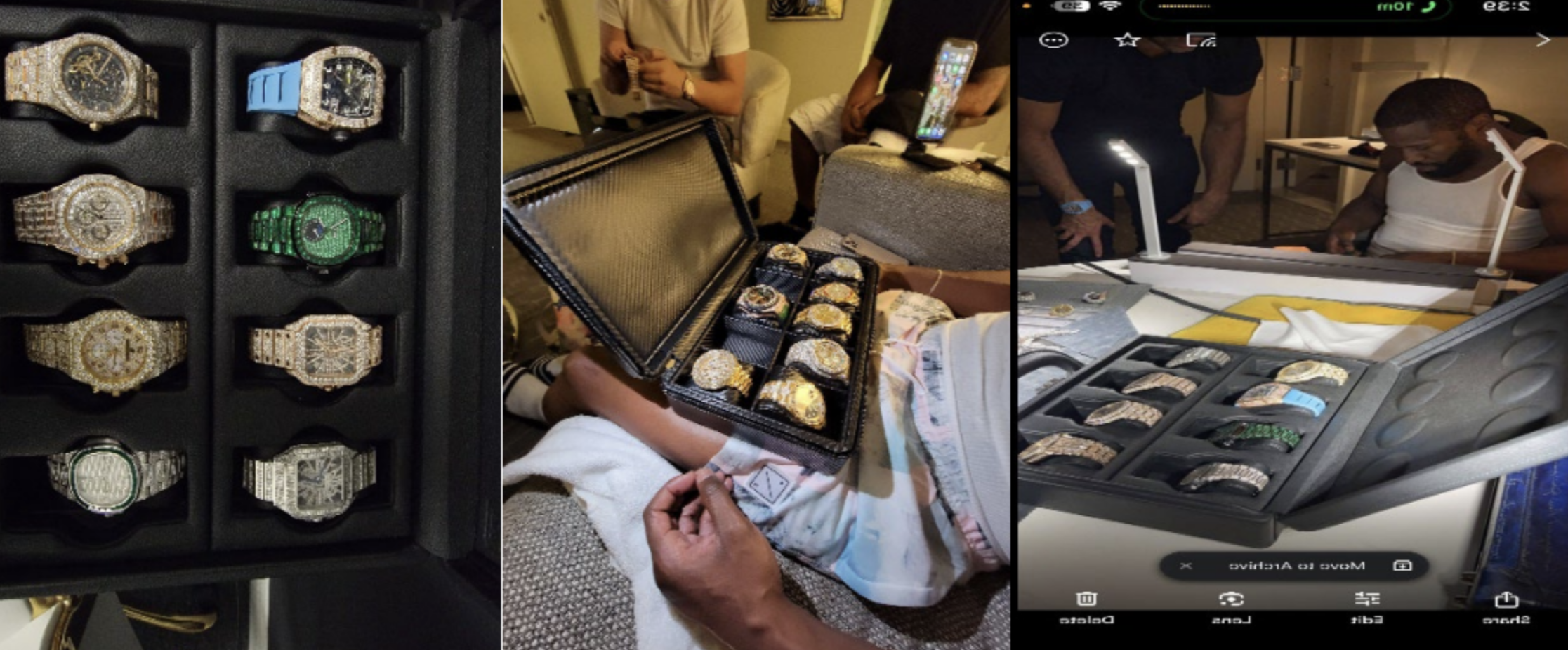 Through a series of meetings with Mayweather and members of TMT at the Fontainebleau Miami Beach in late June 2021, Sulaymanov, who owns Lenzo & Co., claims he sold the boxer a yellow-gold Audemars Piguet watch, two Richard Mille watches, a Patek Philippe watch, a rose-gold Rolex Presidential Day-Date, a diamond ring, and a diamond necklace.