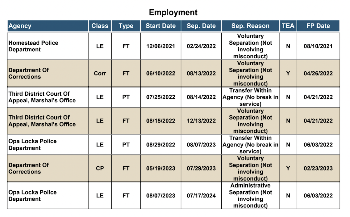 State law enforcement records obtained by New Times show that Alexandre joined Opa-locka’s police force in 2022 and left in July 2024; his departure is listed as “Administrative Separation (Not involving misconduct).”