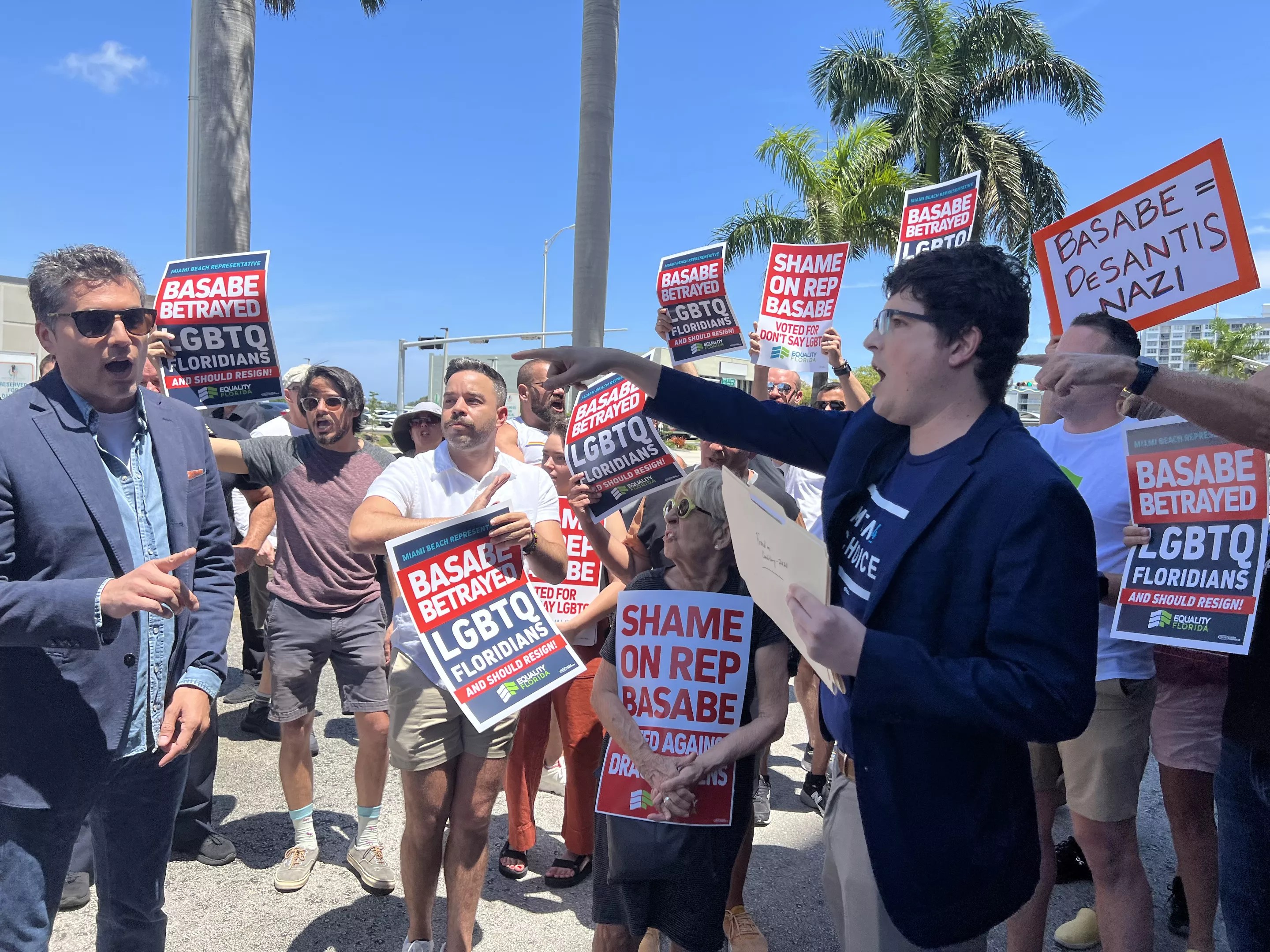 After returning from a legislative session in Tallahassee, state representative Fabián Basabe unexpectedly popped up at a Miami Beach-area protest where advocates demanded his resignation, holding up signs calling him a “DeSantis Nazi” and claiming he “betrayed LGBTQ Floridians.”