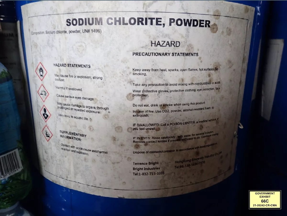 Photos showed several blue chemical drums comprising roughly 10,000 pounds worth of sodium chlorite powder and thousands of bottles of MMS, among other items.