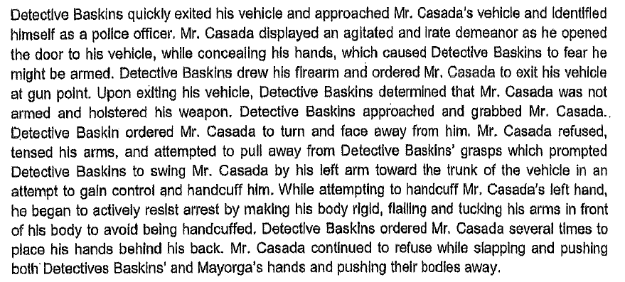 On March 27, 2017, MDPD officers wrote in a sworn arrest affidavit that Casado exited his vehicle “concealing his hands,” which forced the officers to grab him and pin him to the back of his car before punching him in the head, tackling him to the ground, and wrenching his arms behind his back.