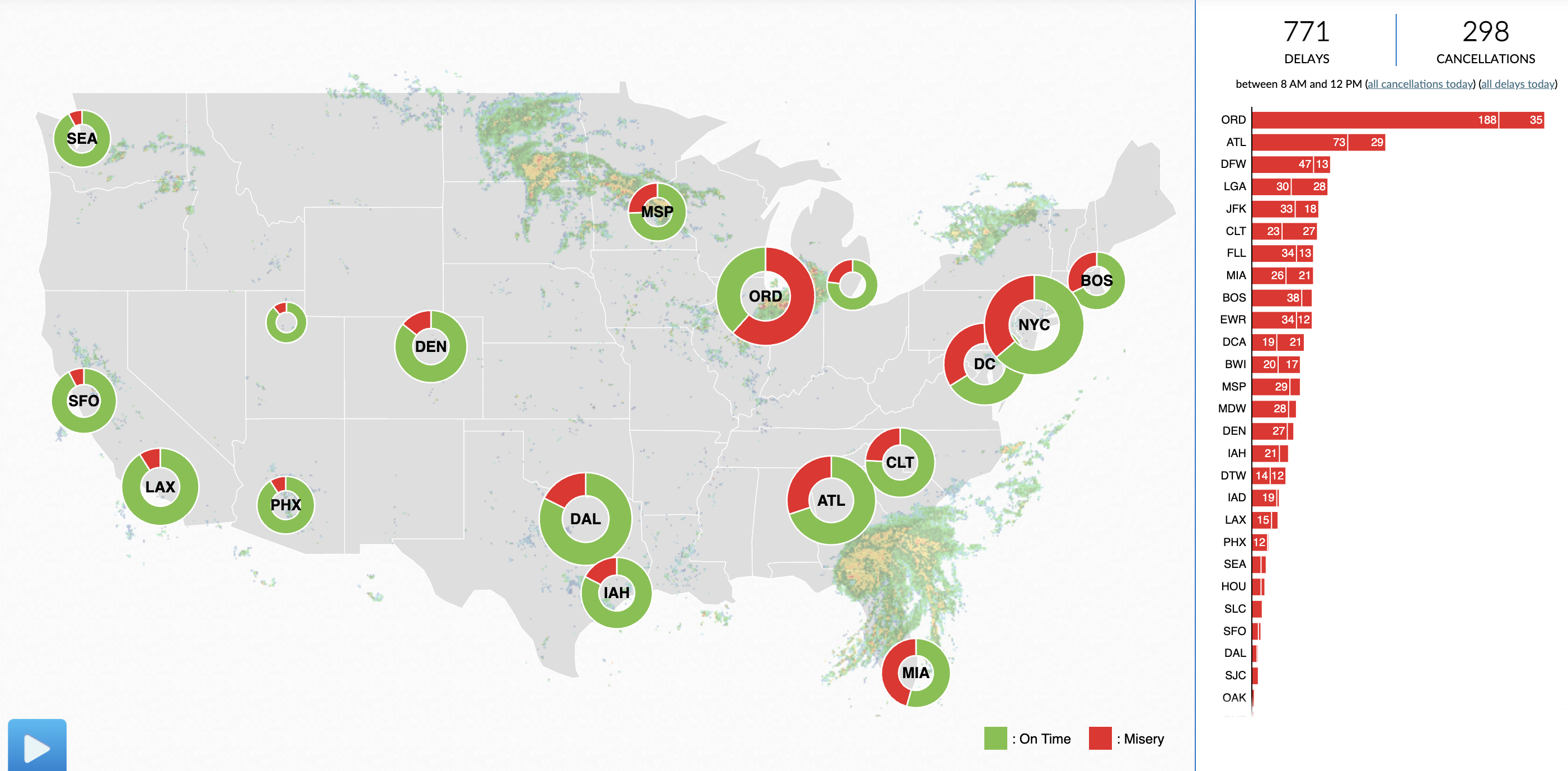 As of 10 a.m. on Monday, MIA had racked up 99 delays and 145 cancellations – eighth-worst in the U.S., according to the website FlightAware. Fort Lauderdale International Airport (FLL) has it a bit worse, with 124 delays and 100 cancellations.