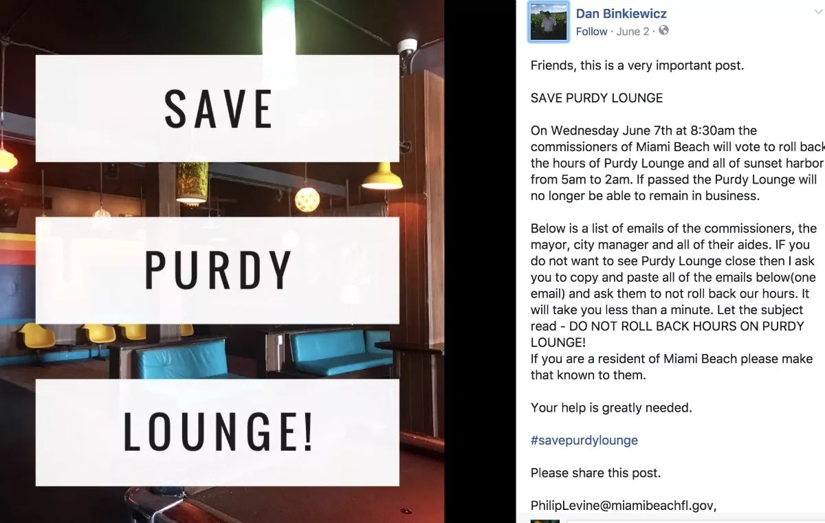 “What’s happened, not just at Purdy, is these 5 a.m. liquor licenses in densely populated neighborhoods can become incompatible with the area,” Arriola says. “Sunset Harbour has gentrified quite a bit recently.”