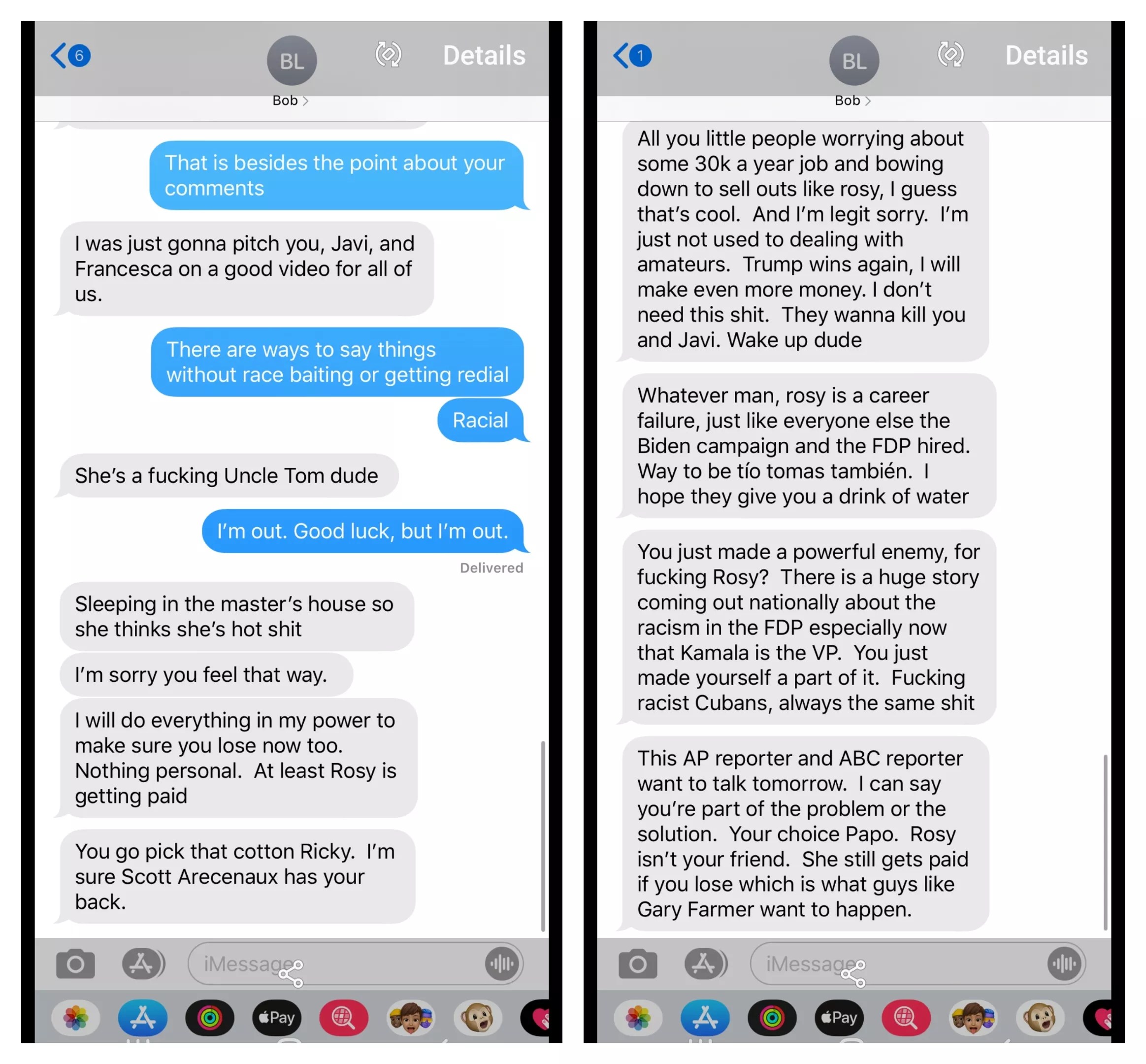 Three members of the Miami-Dade Democratic Party verified to New Times that the screenshots came from Lynch. New Times confirmed Lynch’s phone number as the number from which the texts originated. Peter Schorsch of the political news site Florida Politics also referenced the text messages in a tweet last month.