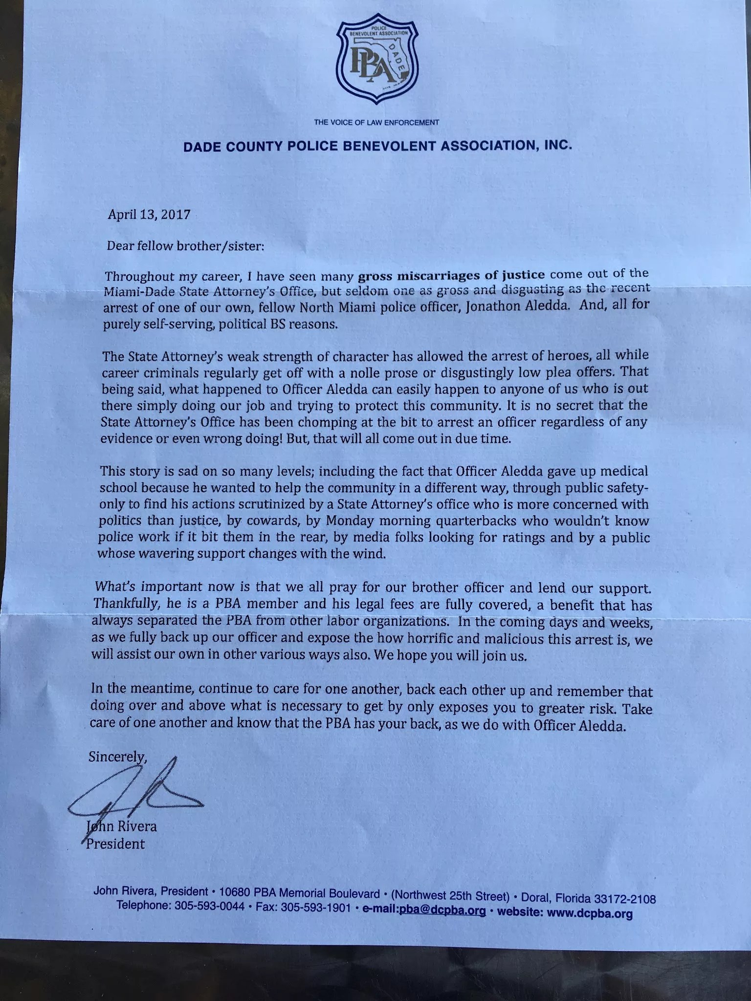 “Throughout my career, I have seen many gross miscarriages of justice come out of the Miami-Dade State Attorney’s Office, but seldom one as gross and disgusting as the recent arrest of one of our own, fellow North Miami police officer, Jonathon Aledda,” Rivera wrote, including the bold text and misspelling of Aledda’s first name. “And, all for purely self-serving, political BS reasons.”