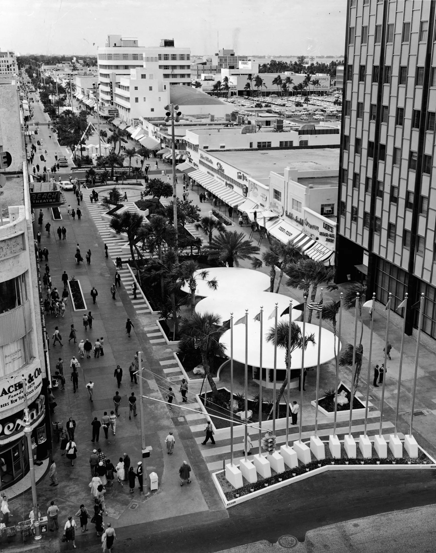 High-angle view looking West along the Lincoln Road Mall in Miami Beach, Florida, in 1950.