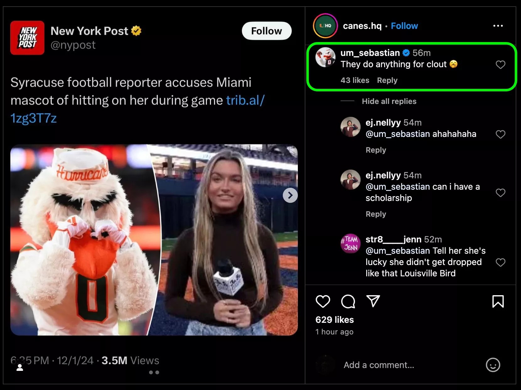 Update 3:45 p.m.: After this story was published, Sebastian the Ibis responded to coverage of the Take a Knee incident, commenting on a post on the @canes.hq fan account: “They do anything for clout 🥱.”