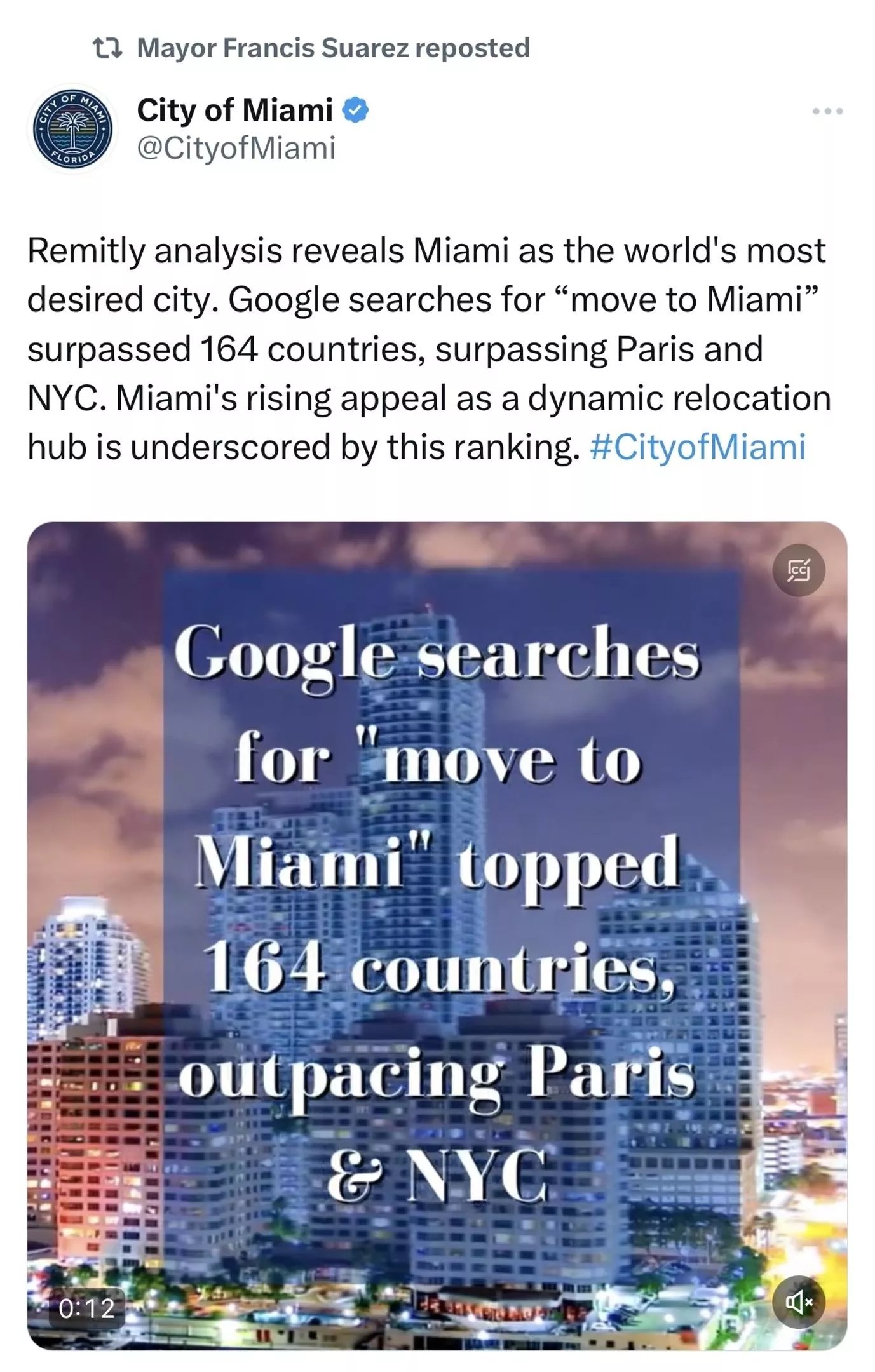 The City of Miami’s social media post would have been more accurate to say, “Remitly analysis reveals Miami as the world’s most desired city the most searched city in 12 countries.”