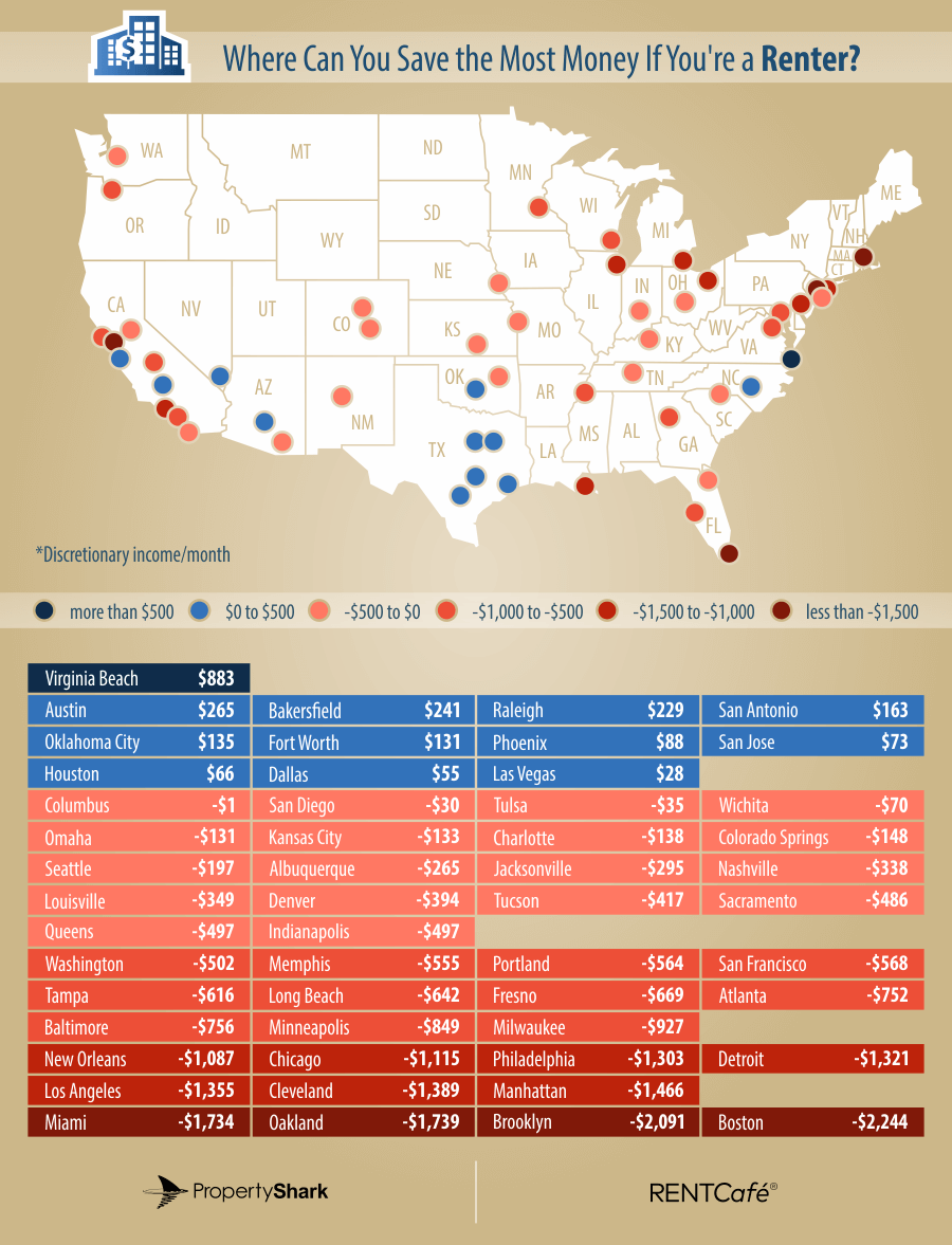 In compiling the study, RentCafé and PropertyShark combined monthly living-cost data from the U.S. Bureau of Labor Statistics with crowdsourced cost-of-living data from the website Numbeo. (Because Numbeo’s data is crowdsourced, you should probably take it with a grain of salt.) The researchers basically subtracted monthly housing and living costs (food, transportation, etc.) from a given city’s median monthly income.