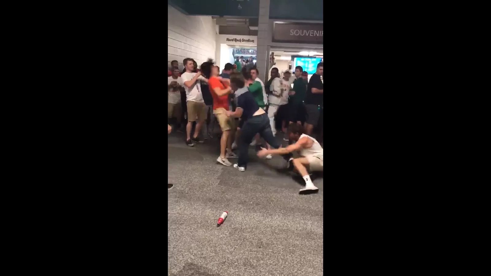 To be honest, these Fighting Irish put up a better showing than the football team they came to watch. In the video, the Notre Dame fans are seen landing a few solid punches, including one swing at the 27-second mark that sends a hapless Miami fan flying off his feet and onto his behind.