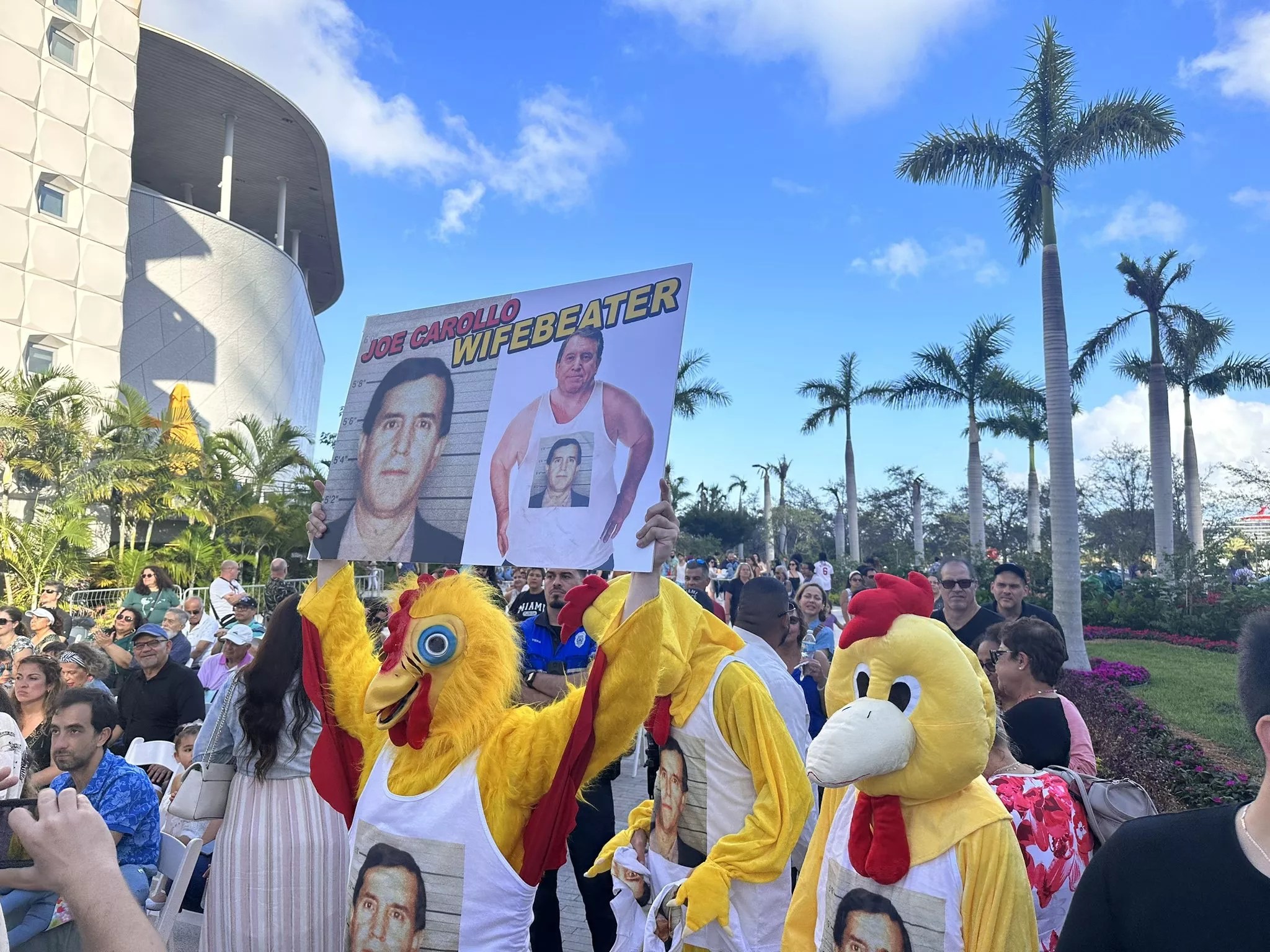 The chickens were wearing sleeveless white undershirts, AKA wifebeaters, emblazoned with Carollo’s mugshot from his 2001 arrest on a domestic battery charge while he was in the midst of divorce proceedings. Carollo, who was the mayor of Miami at the time, was jailed for allegedly striking his soon-to-be ex-wife with a teapot at their marital home, leaving a large welt.