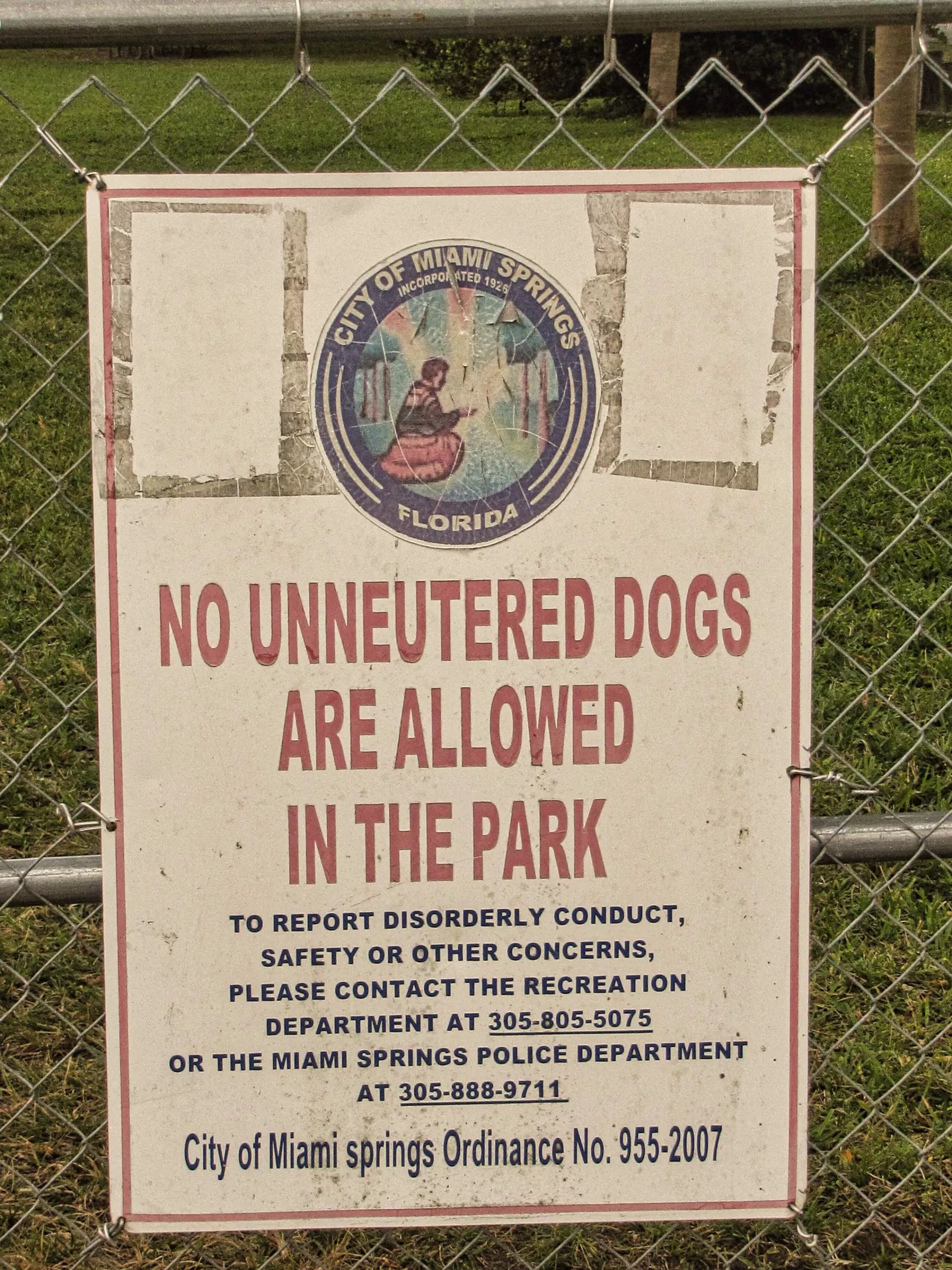 No ifs, ands, or balls — er, buts: The City of Miami Springs DOES NOT allow un-neutered dogs in its dog park.