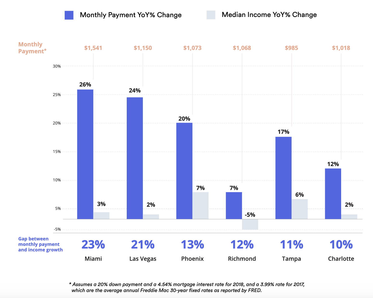 The company notes that Miami also tops the nation in monthly mortgage-payment growth from 2017 to 2018 – and wage growth doesn’t even come close to keeping up: