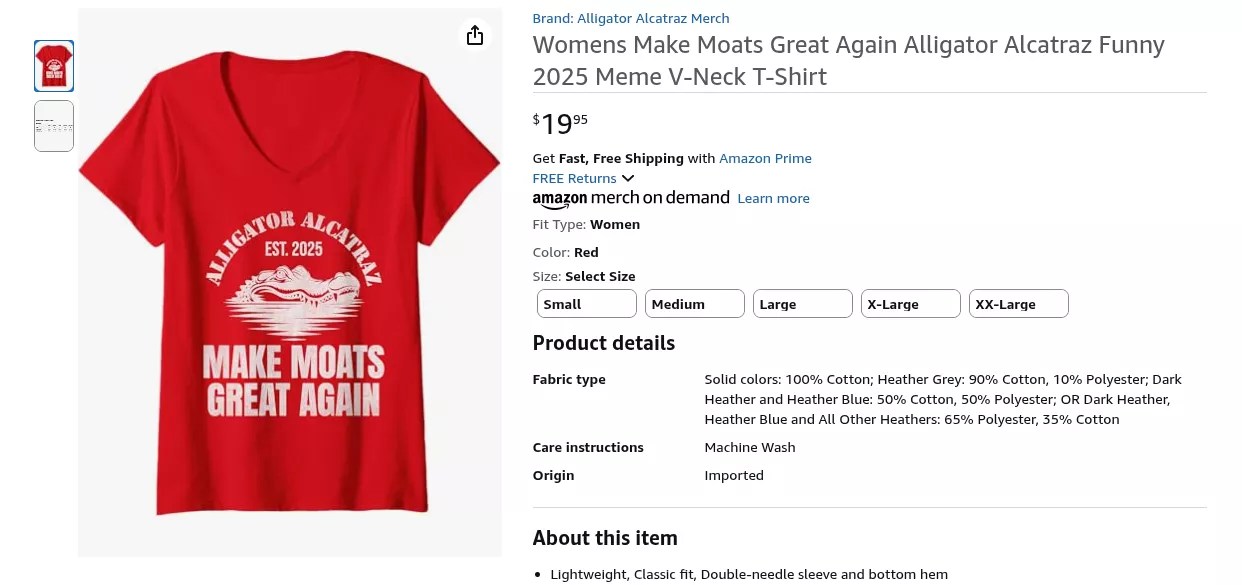 Attention all Florida men: Be sure to buy the red “Make Moat Greats Again” V-neck for the wifey – it will pair perfectly with her MAGA hat. The brand “Alligator Alcatraz Merch” on Amazon is hawking a lot of gear in honor of the controversial facility.