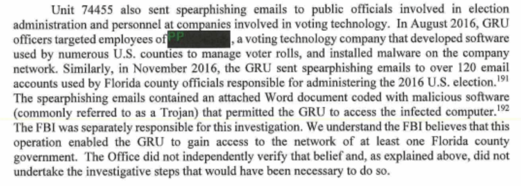 “We understand that the FBI believes that this operation enabled the GRU to gain access to the network of at least one Florida county government,” the Mueller report states.