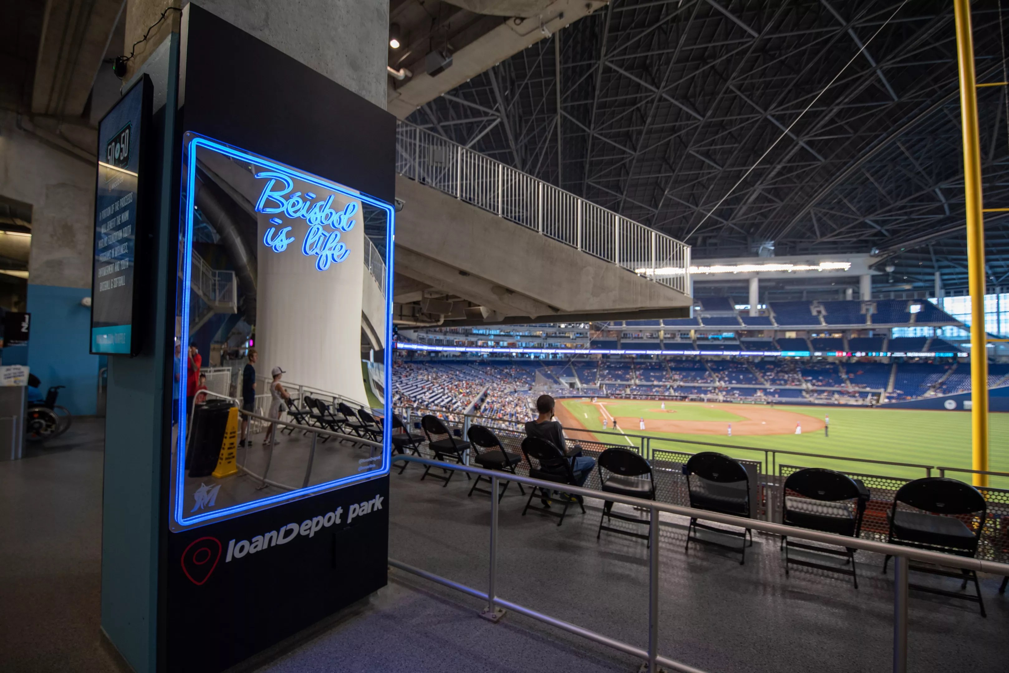 In the team’s continued efforts to enhance the fan experience at LoanDepot Park, they’ve sprinkled what they’re calling “social spaces” across the promenade level. Fans are now able to take photos in front of a neon-illuminated baseball wall in Section 15 and stylized selfie mirrors in Section 1. Multiple installations allow fans to document their trip to the park in a unique, flashy, and, well, extremely Miami way.