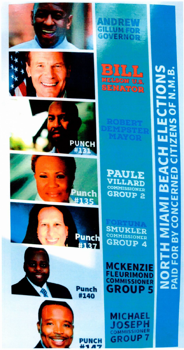 The leaflet, which has been spread around North Miami Beach ahead of the November 6 voting, includes two candidates who have actually earned the support of Obama: gubernatorial candidate Andrew Gillum and Sen. Bill Nelson. But the flyer also lists a slate of North Miami Beach candidates, none of whom seem to have a connection to, or endorsement from, Obama. They include mayoral candidate Robert Dempster and commission hopefuls Paule Villard, Fortuna Smukler, McKenzie Fleurimond, and Michael Joseph.