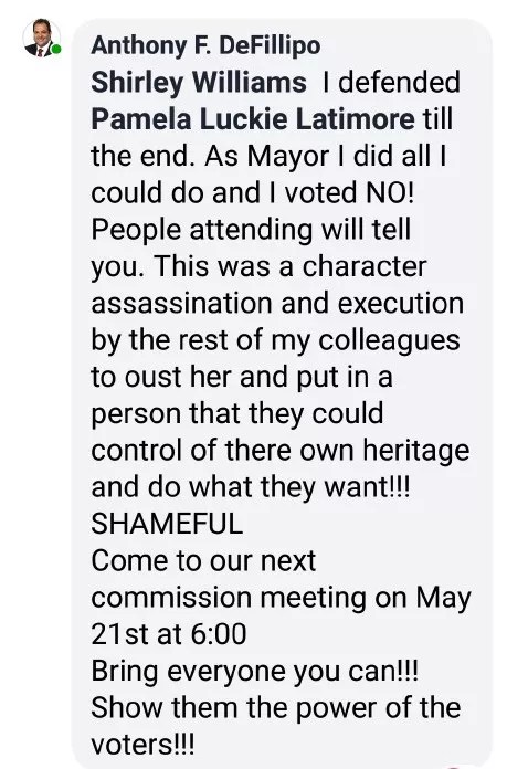 His latest controversy came after the city voted to fire its former clerk, Pamela Latimore. DeFillipo opposed her termination and was the lone commissioner to vote against the move. After the vote, he hopped onto Facebook and launched into a since-deleted tirade: