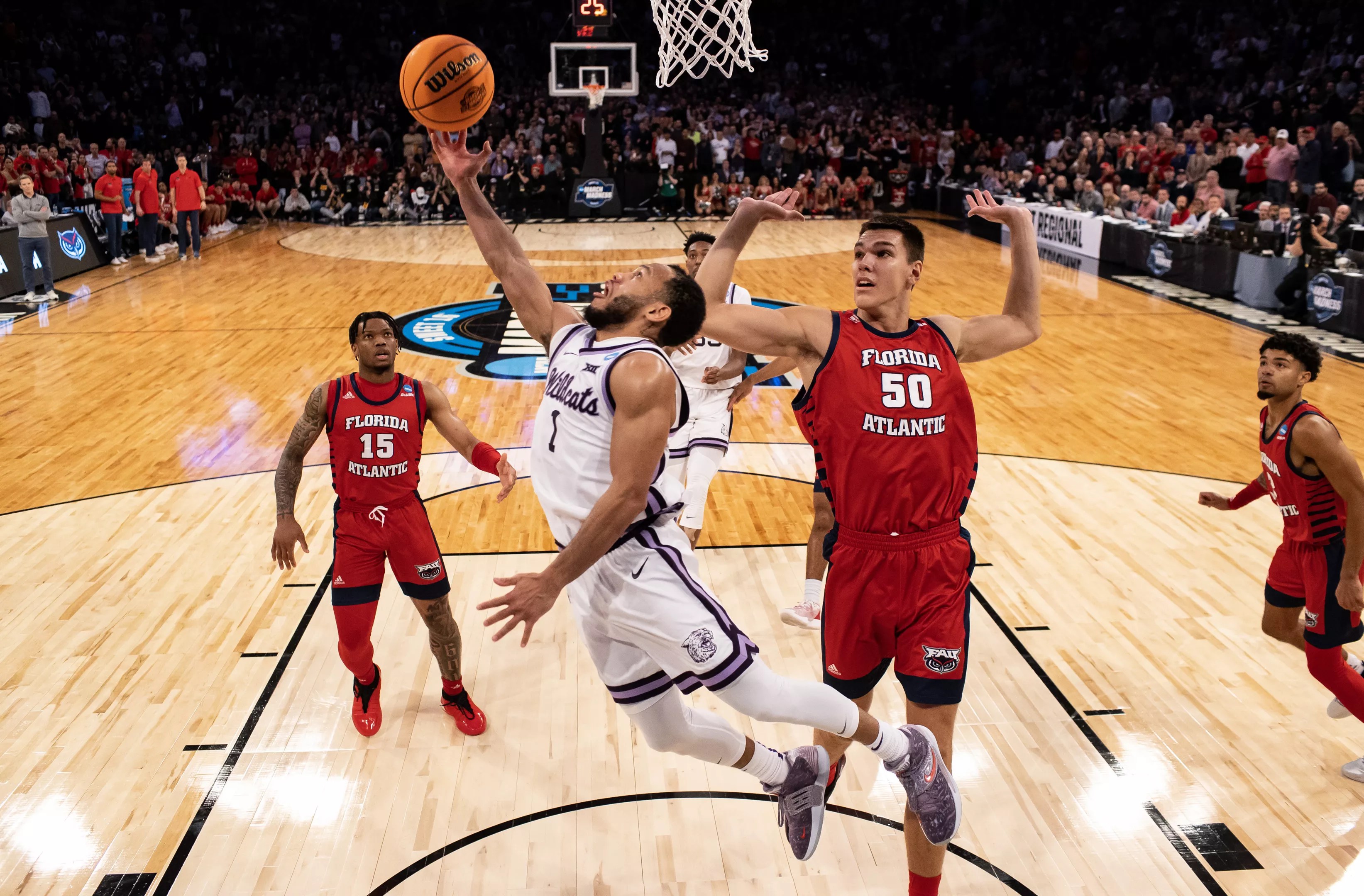 Markquis Nowell of the Kansas State Wildcats goes to the hoop against Vladislav Goldin of the FAU Owls in the NCAA Men's Basketball Tournament on March 25, 2023 in New York City.