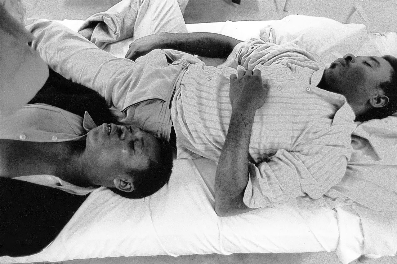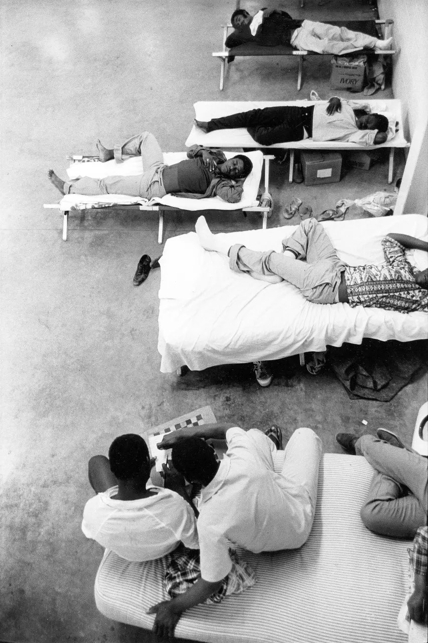 Male detainees sitting on beds inside what is now known as the Krome Detention Center.