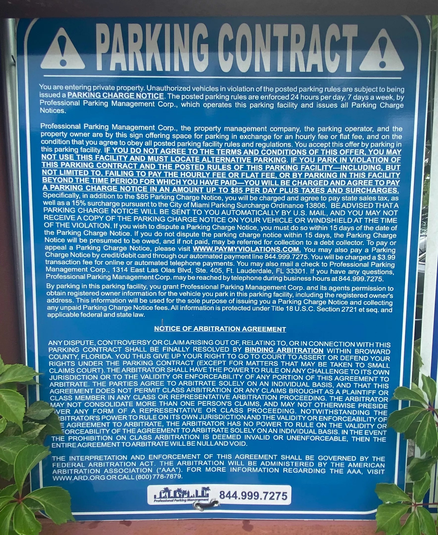 Indeed, a blue sign at the entrance to lots where PPM operates spells out a roughly 900-word “Parking Contract.”‘ And, although nobody will actually get out of their car to read that fine print before parking, its mere presence likely satisfies legal requirements established under U.S. contract law.