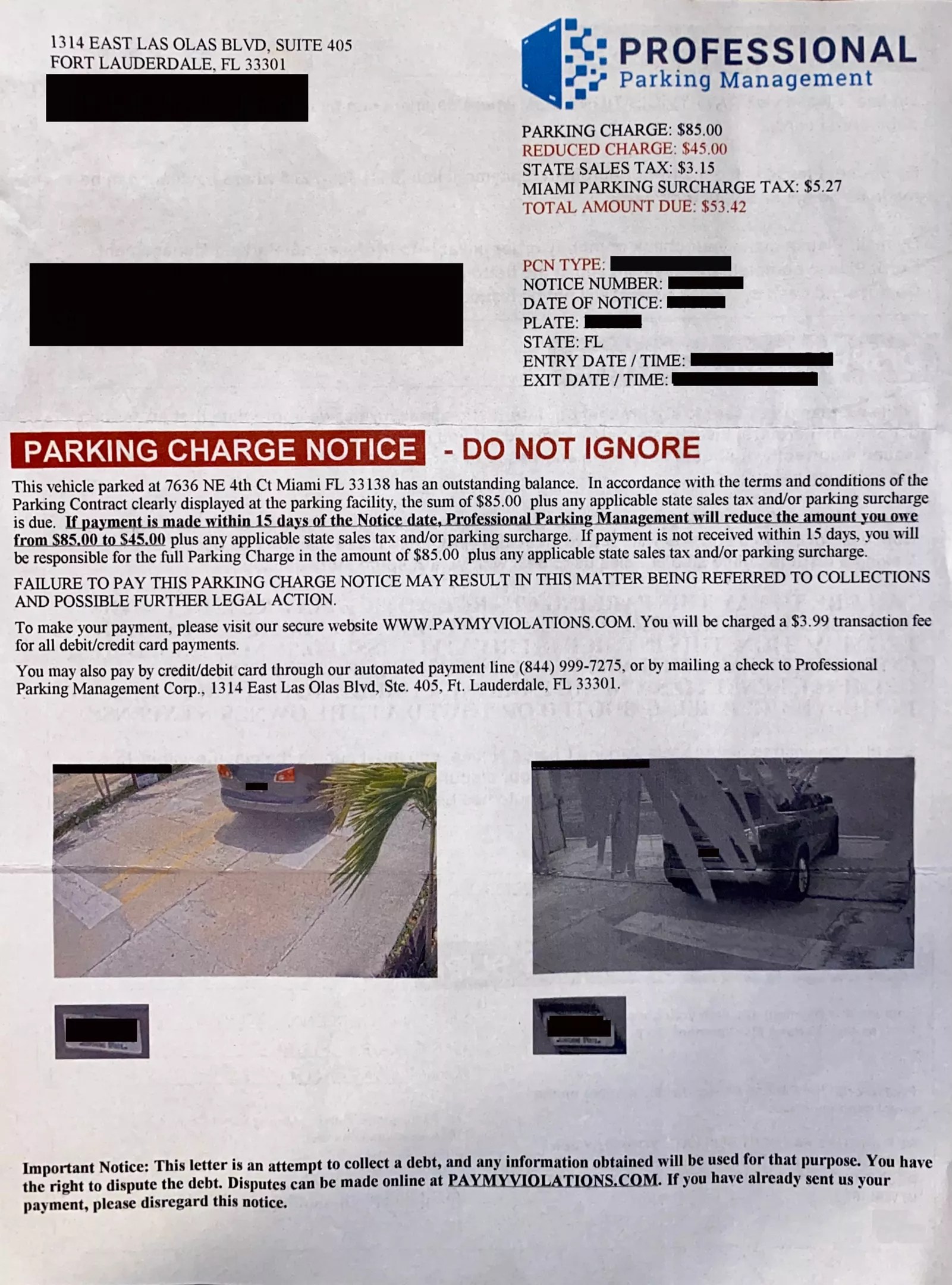 Zavaleta received a “notice” in the mail stating that she had overstayed her allotted time, and now owed money to a private company called Professional Parking Management. Similar to a ticket from a red-light camera, the notice included two photos of Zavaleta’s car: one entering the lot and one leaving, with a timestamp on each. The amount of time between her entry and exit exceeded the time she purchased on the lot’s PayByPhone app by some 20 minutes. That infraction would cost her $85. A slew of fees and taxes – “State Sales Tax” ($3.15), the “Miami Parking Surcharge Tax” ($5.27), “Transaction Fee” ($3.99) – would add an extra $12.41, bringing the bill to $97.41. If she paid within 15 days, however, the “Reduced Charge” would total $57.41.