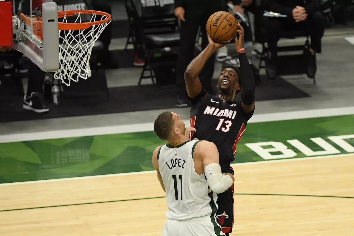Bam Adebayo shoots during Game Two of the first-round playoff series between the Milwaukee Bucks and the Miami Heat at Fiserv Forum on May 24, 2021, in Milwaukee, Wisconsin.