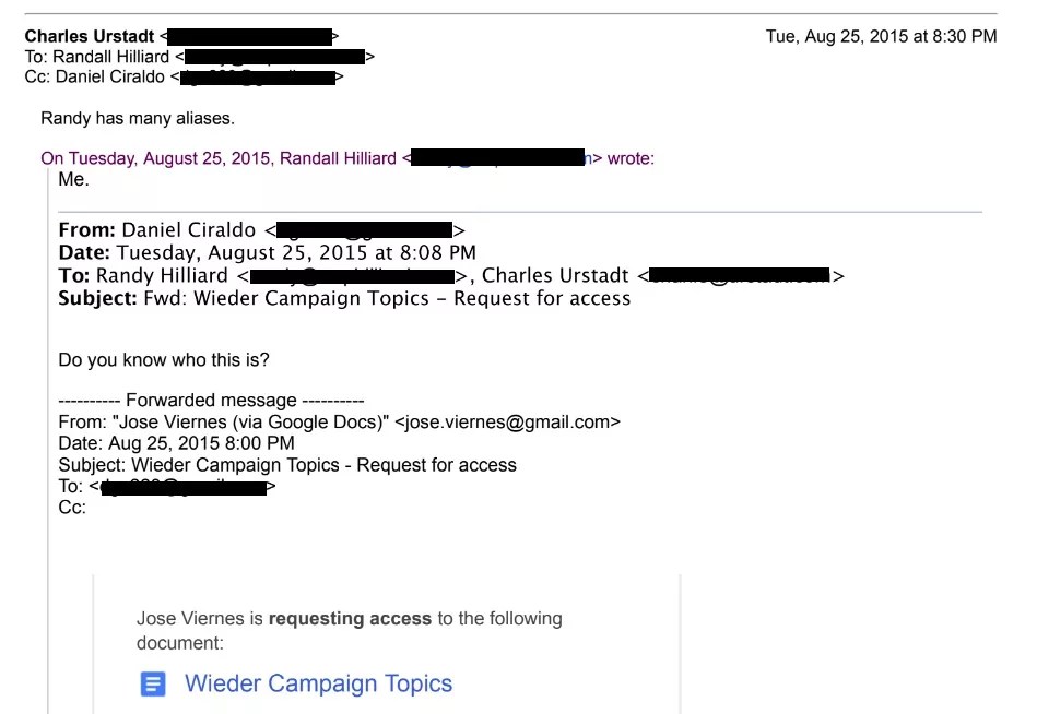 A 2015 email shows Randy Hilliard has used the alias “Jose Viernes.”