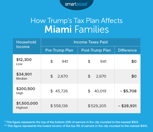In fact, if you’re a Miami millionaire, you’re in for a huge windfall under the Tax Cuts and Jobs Act. The financial-advisory website SmartAsset estimates Miamians making more than $1.5 million in household income per year would pay $28,931 less in annual federal taxes under the plan.