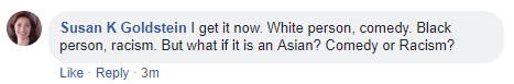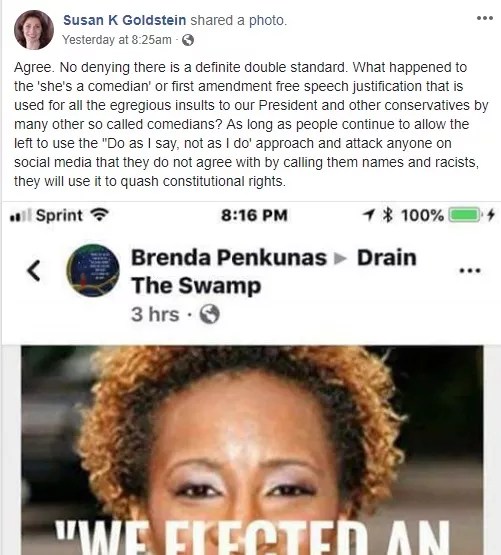After Roseanne Barr got her show canceled this past Tuesday for comparing a black woman to an ape, Goldstein decided to go on a public Facebook rant decrying what she feels is a “double standard” between liberals and conservatives. Why, she repeatedly asked online, are people not racist for comparing Donald Trump to an orangutan but racist when someone like Barr compares a black woman to an ape?