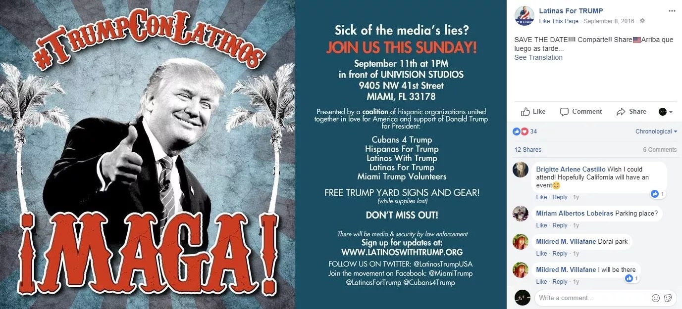 Only one publicized, pro-Trump rally appears to have taken place in the Miami area — #LatinosConTrump in Doral at 1 p.m September 11, 2016. The event was pitched as an “anti-media” protest outside the town’s Univision offices. The national group Latinos With Trump created flyers for the rally and noted that virtually all of Miami’s most prominent pro-Trump groups — Cubans 4 Trump, Hispanas for Trump, Latinas for Trump, and the official Miami Trump Volunteers — would attend. The official Facebook pages for Latinas for Trump and the Miami Trump Volunteers even shared the flyer: