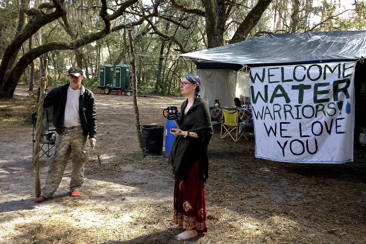 Beneath the blue Suwannee County sky, someone tapped out a beat on a tribal drum. Two young women sat cross-legged behind the wheels of a construction truck, their arms locked to the bottom of the vehicle. Dozens of deputies in shades of green and khaki stood in formation watching over the hundreds of protesters who had descended upon the North Florida construction site, where a massive natural gas pipeline was being fitted into the ground.