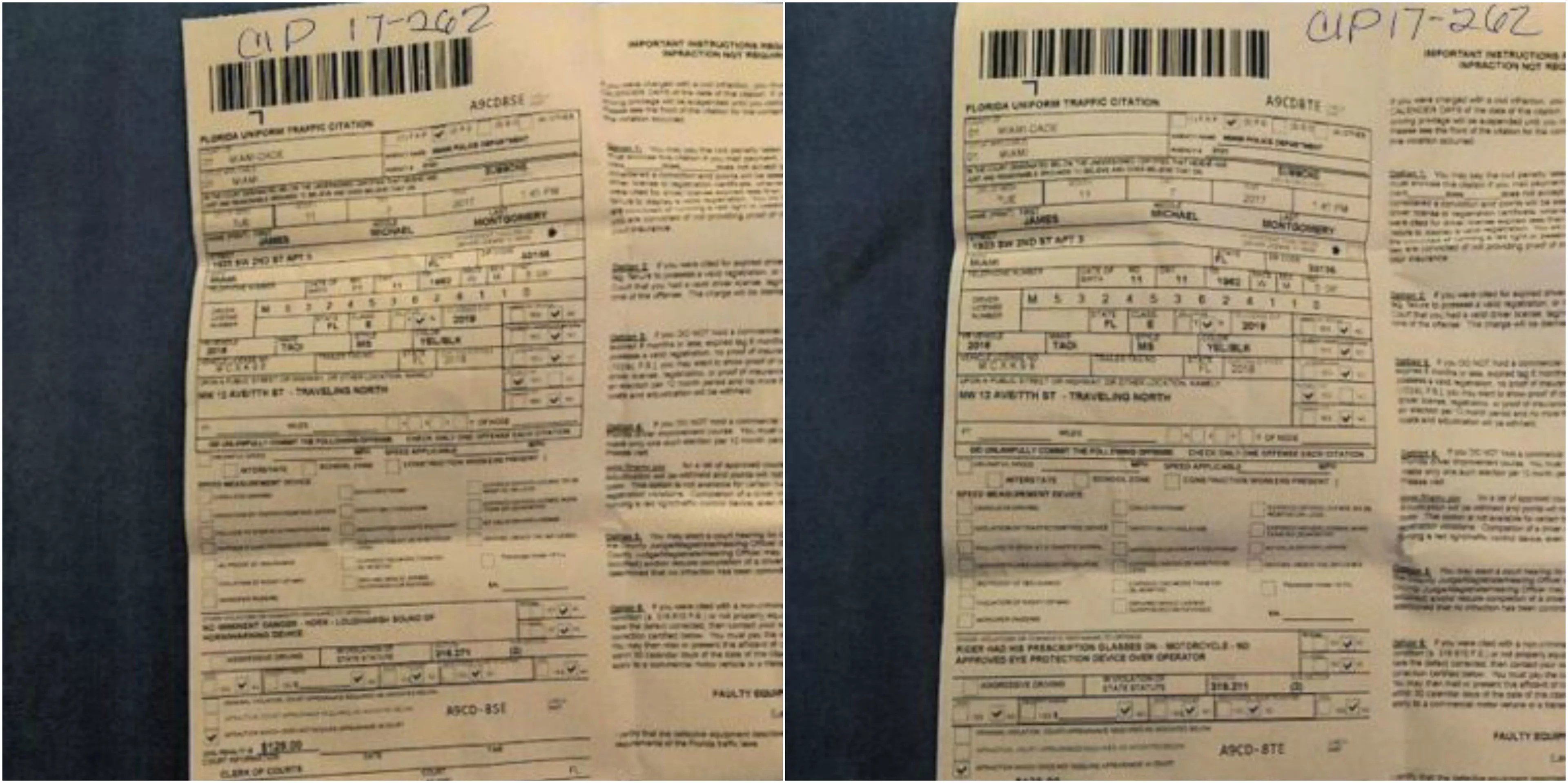 Trying to stop a police officer from pulling an illegal turn had consequences, though. After getting out of his patrol car and asking Montgomery whether his horn was broken, Officer Matthew Hall gave the 54-year-old military veteran a ticket for improper use of a horn. He threw in a second citation for not wearing approved eye protection – even though Montgomery was wearing a helmet with a “DOT approved” sticker on it.