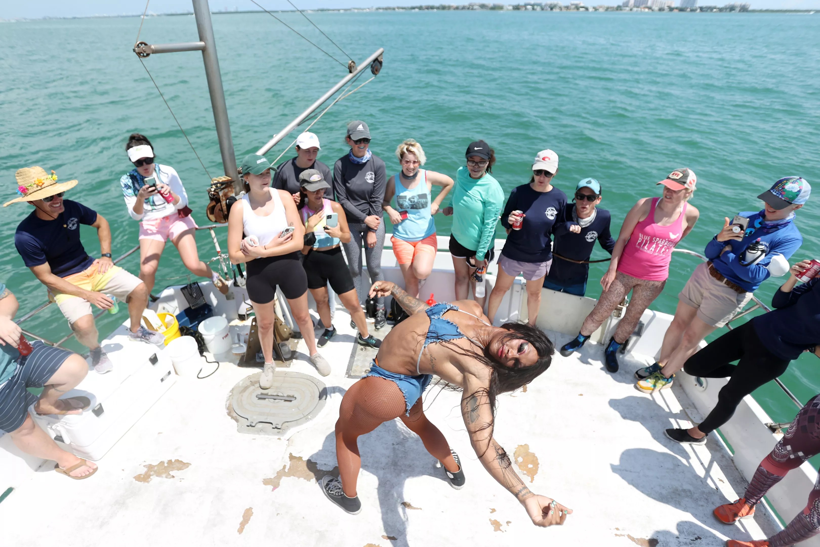 Throughout Saturday’s six-hour voyage, the cheers continue as Miss Toto jolts into splits under the bright afternoon sun and a pod of dolphins leaps and pirouettes out of the water, relentlessly chasing the boat’s wake.