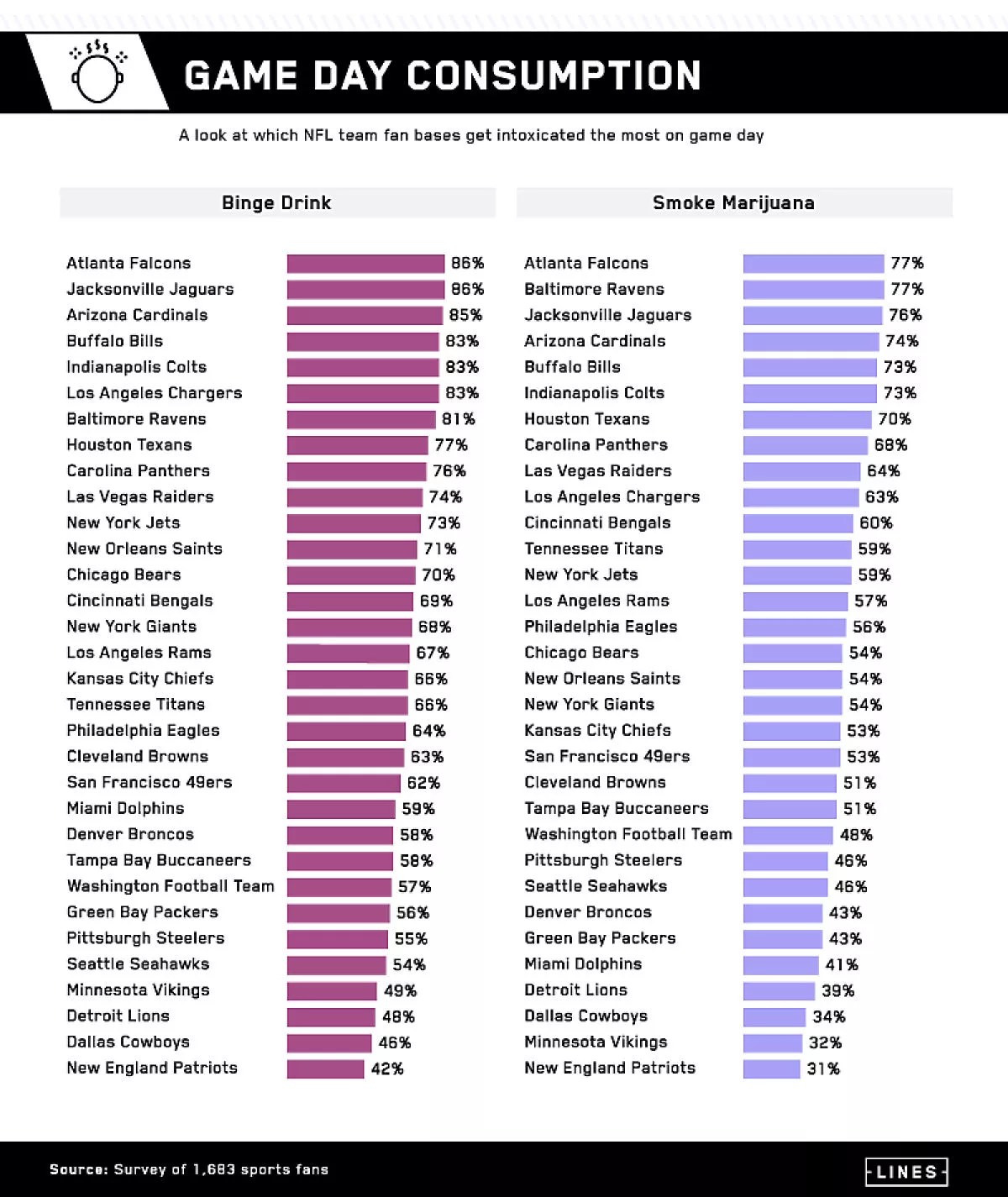 The survey found there was a clear winner in the “sports fans most likely to get lit” department: fans of the 4-12 Atlanta Falcons. Falcons fans topped the list, with 86 percent admitting to binge-drinking and 77 percent reporting smoking marijuana while watching games. Clearly, they’re still not over their team blowing a 28-3 lead over the New England Patriots in 2017’s Super Bowl LI. Who can blame them, really?
