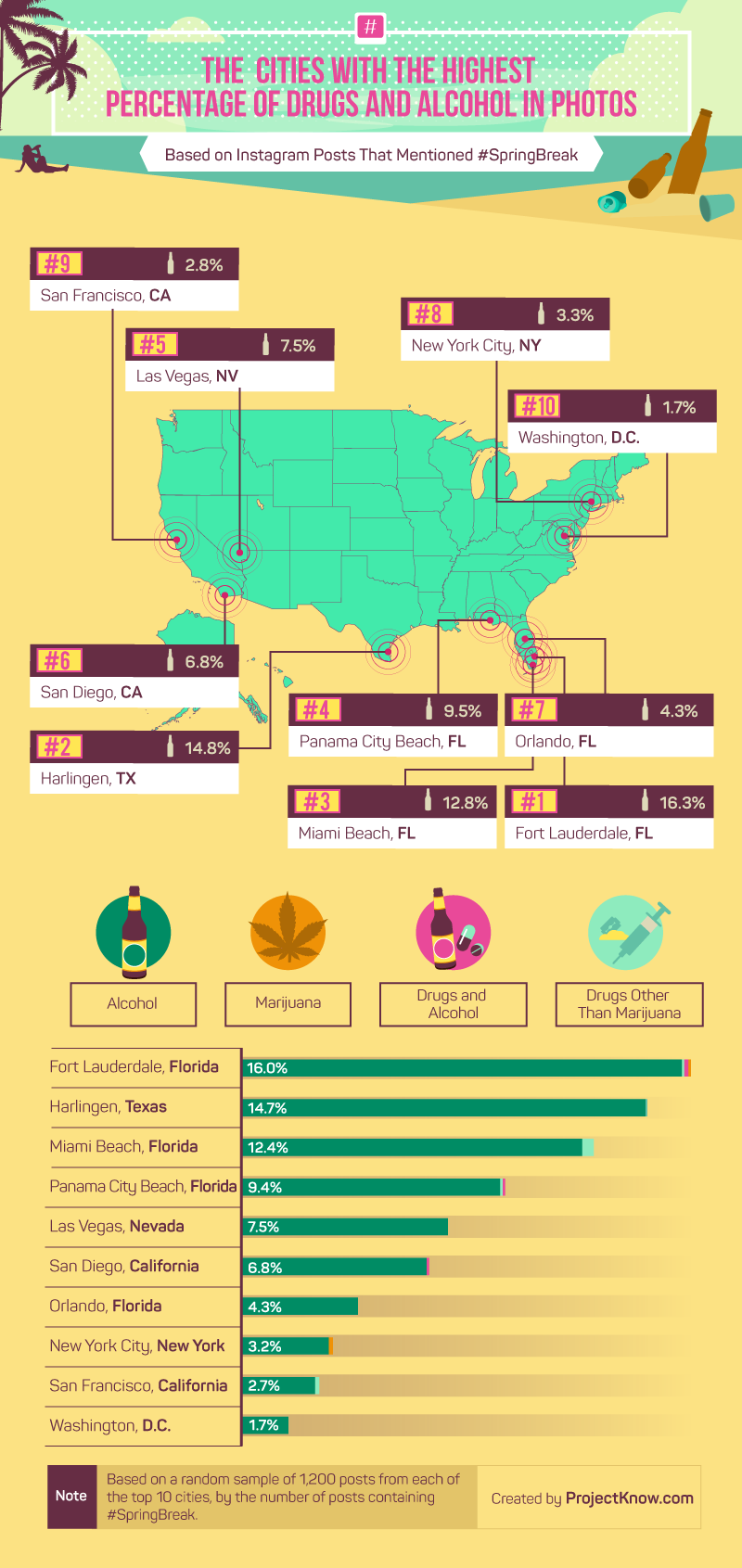 The rest of the results are perhaps unsurprising. Although Fort Lauderdale got top honors for overall intoxication, Miami Beach was the most Instagrammed spring break locale, with 16,000 posts. Spring breakers in Miami also mentioned drugs more than vacationers in any other city.