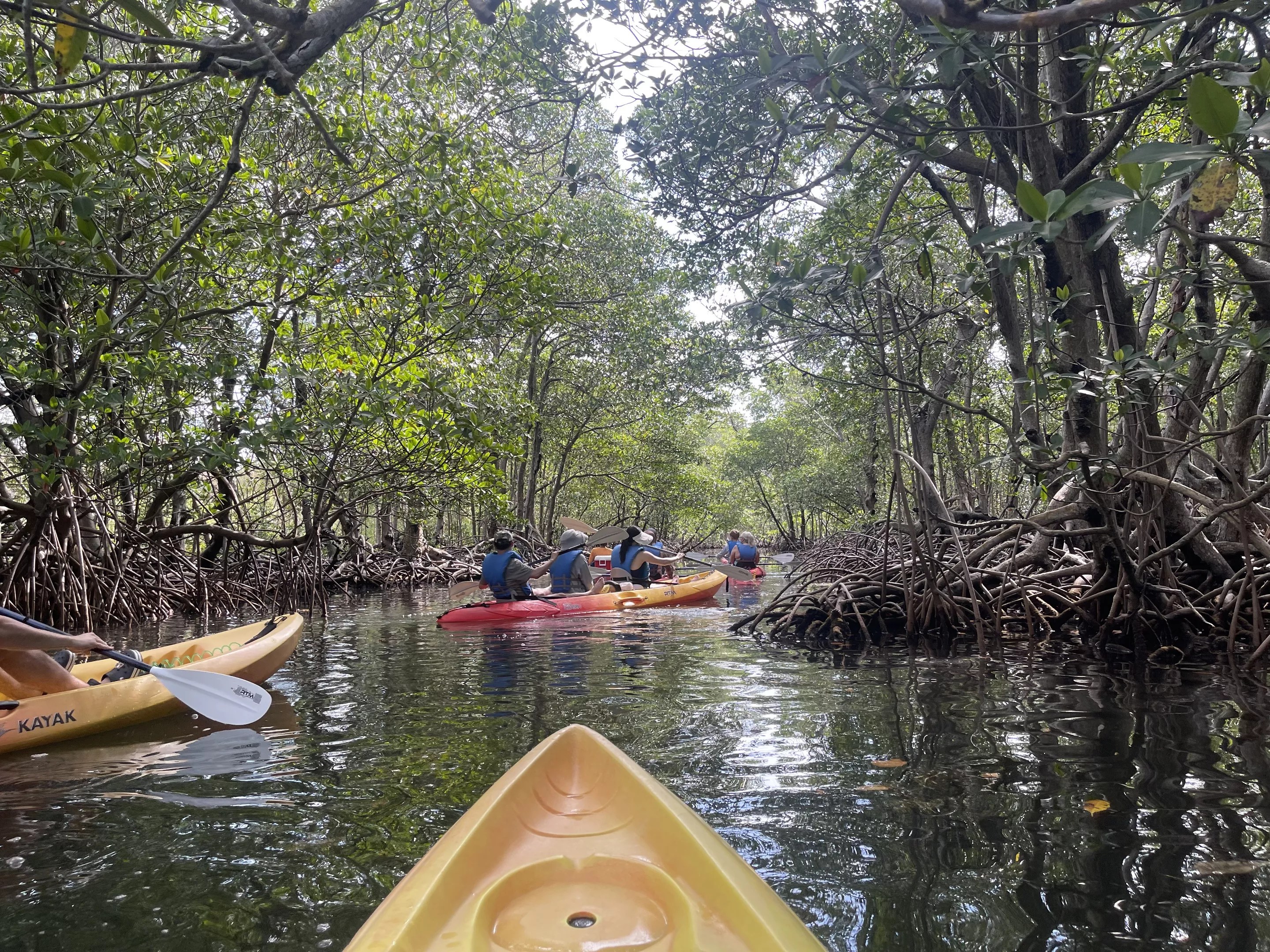 A few minutes after a short kayaking tutorial, a ceiling of winding mangrove branches enclosed us. The thin limbs wove an intricate tapestry of foliage above the shallow waters we paddled through. Their exposed root systems seemed to sprawl with the same inconsistency, like curling fingers inviting you further into the wilderness.