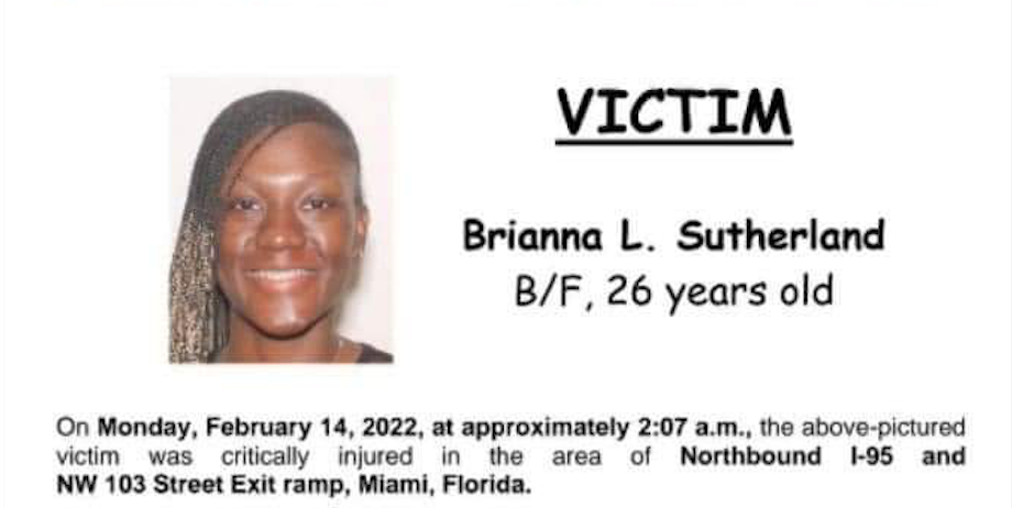 At approximately 2:07 a.m. on Monday, February 14, 26-year-old Briana Sutherland was driving a blue BMW on I-95 north when, witnesses say, another vehicle fired shots into her vehicle. Sutherland crashed into a wall near the NW 103rd Street exit ramp in Miami Shores and was rushed to Jackson Memorial Hospital Ryder Trauma Center, where she was placed on life support.