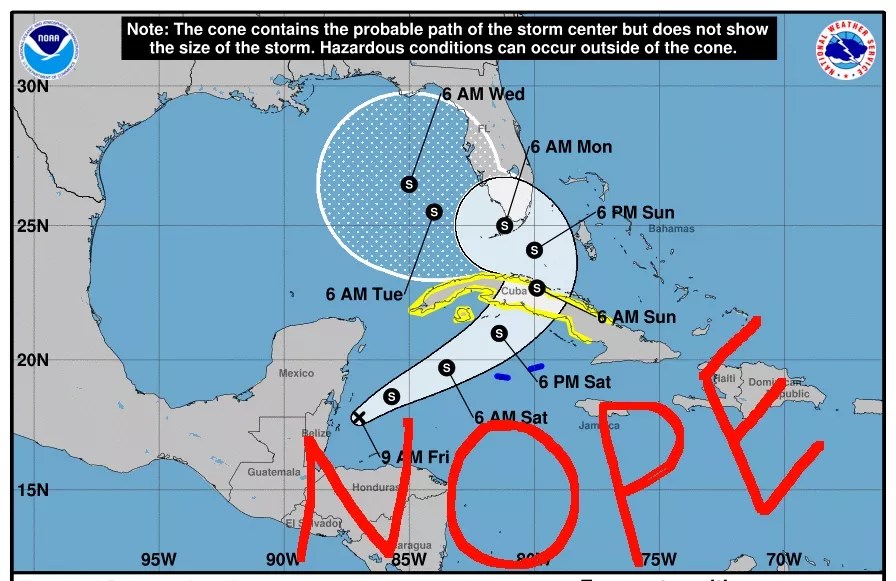 Fri AM Threat Cone maintains forecast track into South Florida / Keys Sunday & Monday. Eta is expected to be a large tropical storm when it passes us so it doesn't matter if you're IN or OUT of the cone, what matters is if you're in the tropical storm conditions area (yellow). pic.twitter.com/nP62GbbE2U