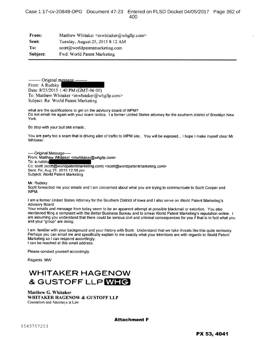Whitaker not only sat on the board of World Patent Marketing but also once sent a threatening email to a former customer who had complained after he spent thousands of dollars and did not receive the promised services. Court records obtained by New Times for a 2017 feature about the fraudulent company show that in an August 2015 email to a disgruntled customer, Whitaker touted his background as a former federal attorney and suggested that filing a complaint with the Better Business Bureau and “smearing” the company online could result in “serious civil and criminal consequences.”