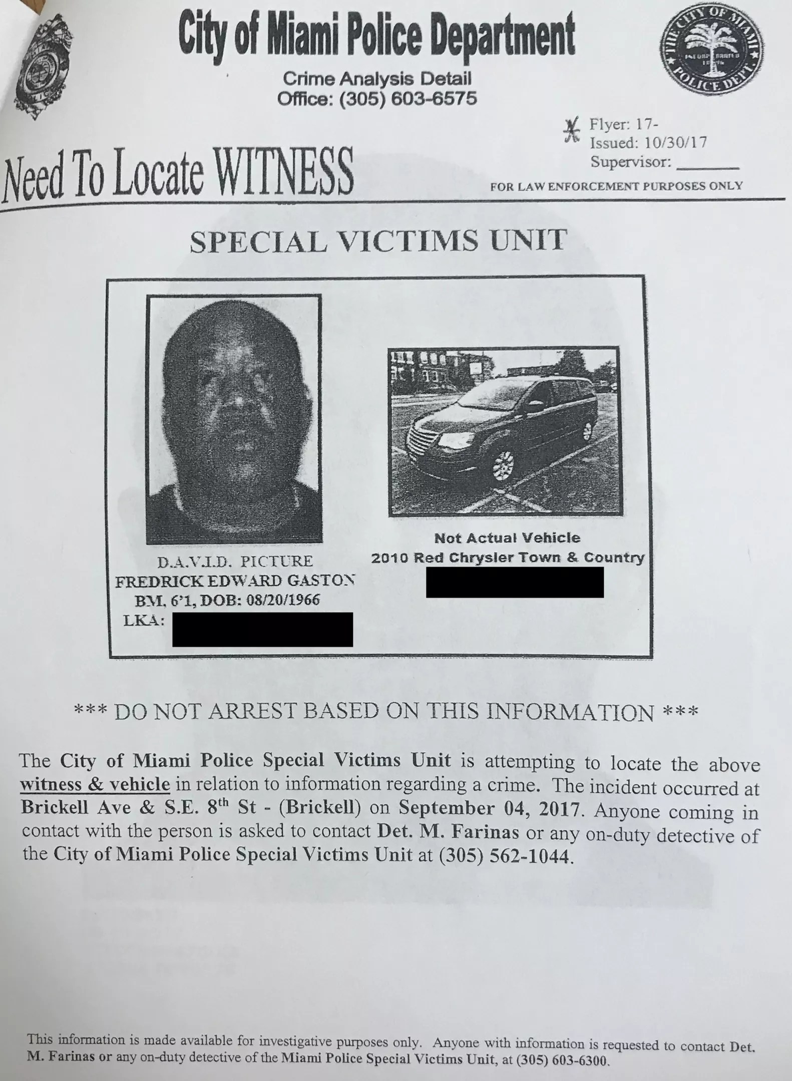 Farinas decided to distribute posters to officers on patrol in Wynwood during Art Basel. It was a last-ditch attempt to get Gaston to willingly come forward – not as a suspect, but as a witness.